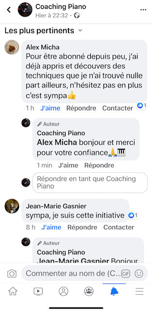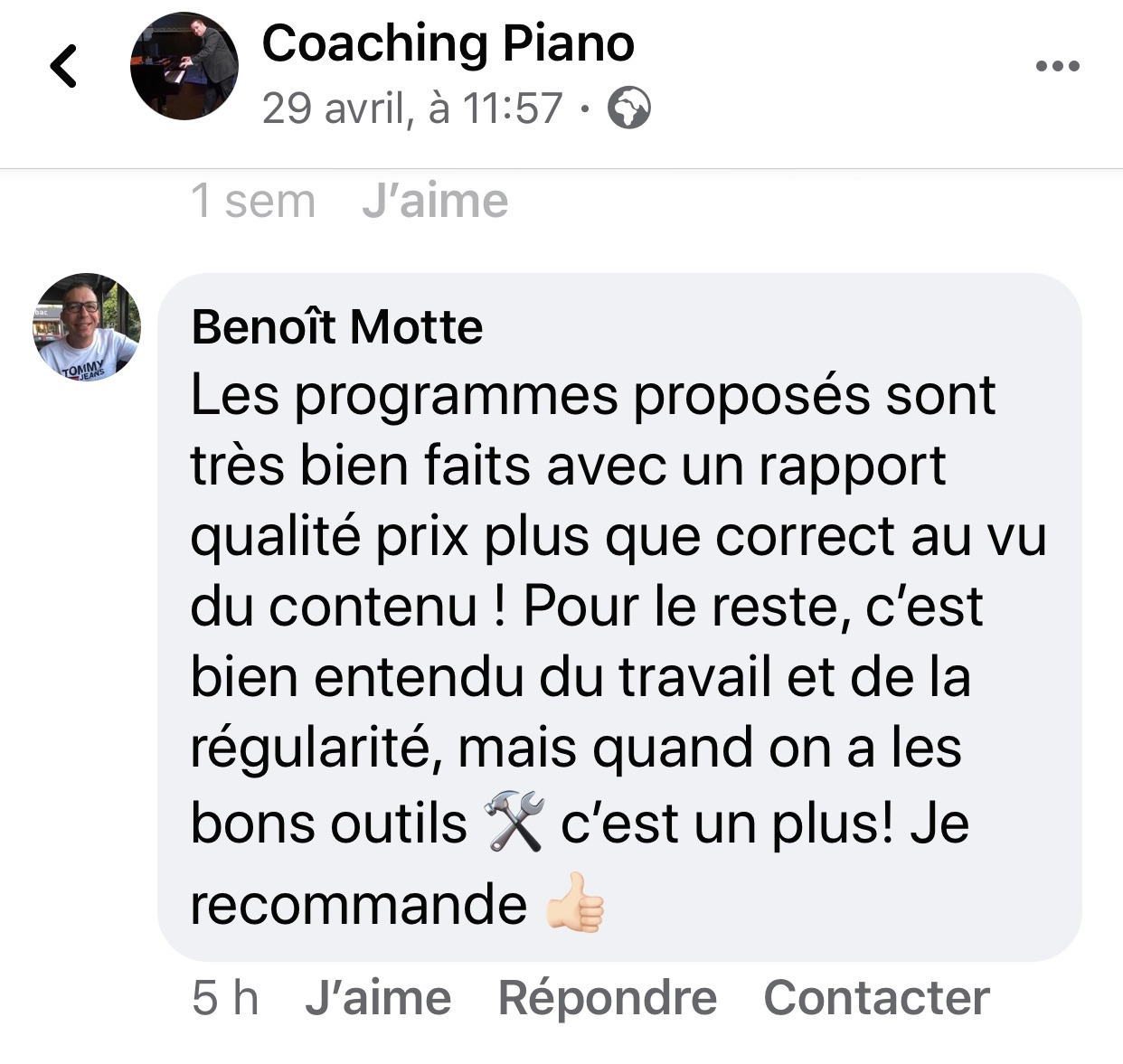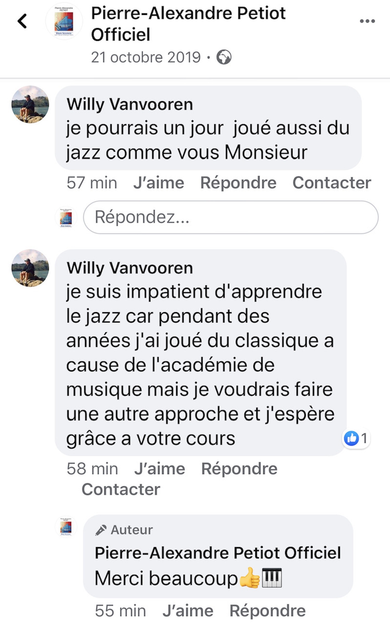 À la retraite, j'ai (ré)débuté le piano : je me suis offert un piano et quatre ans de musique classique J'aimais beaucoup le jazz et je sentais que ça me donnerait plus de liberté pour oser un jour improviser et peut être un jour accompagner mon mari qui débute le saxophone. Il faut s'accrocher faut ,s'entraîner un peu tous les jours comme le sport : oui oui.... Mais ça avance pas à pas.... Merci Pierre Alexandre de m'accompagner patiemment dans cette nouvelle expérience, ce nouveau défît. Alors vous aussi, OSEZ!!!!! Le jazz ,ça donne des ailes !